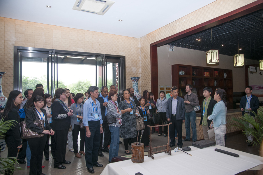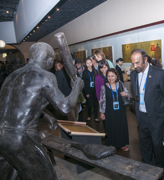 從一進(jìn)中國(guó)火腿博覽館的大門開始,使節(jié)們就被眼前精美的浮雕所吸引。透過金字火腿吳月肖副總經(jīng)理有趣的解說和翻譯的詳盡翻譯,50余人才搞明白:原來這就是著名的《百姓勞軍圖》,而使節(jié)中的一些“中國(guó)通”發(fā)現(xiàn)他們熟知岳飛的師傅宗澤,原來竟然是金華火腿的祖師爺,火腿原料金華兩頭烏如此有趣珍貴,就好比中國(guó)的熊貓。